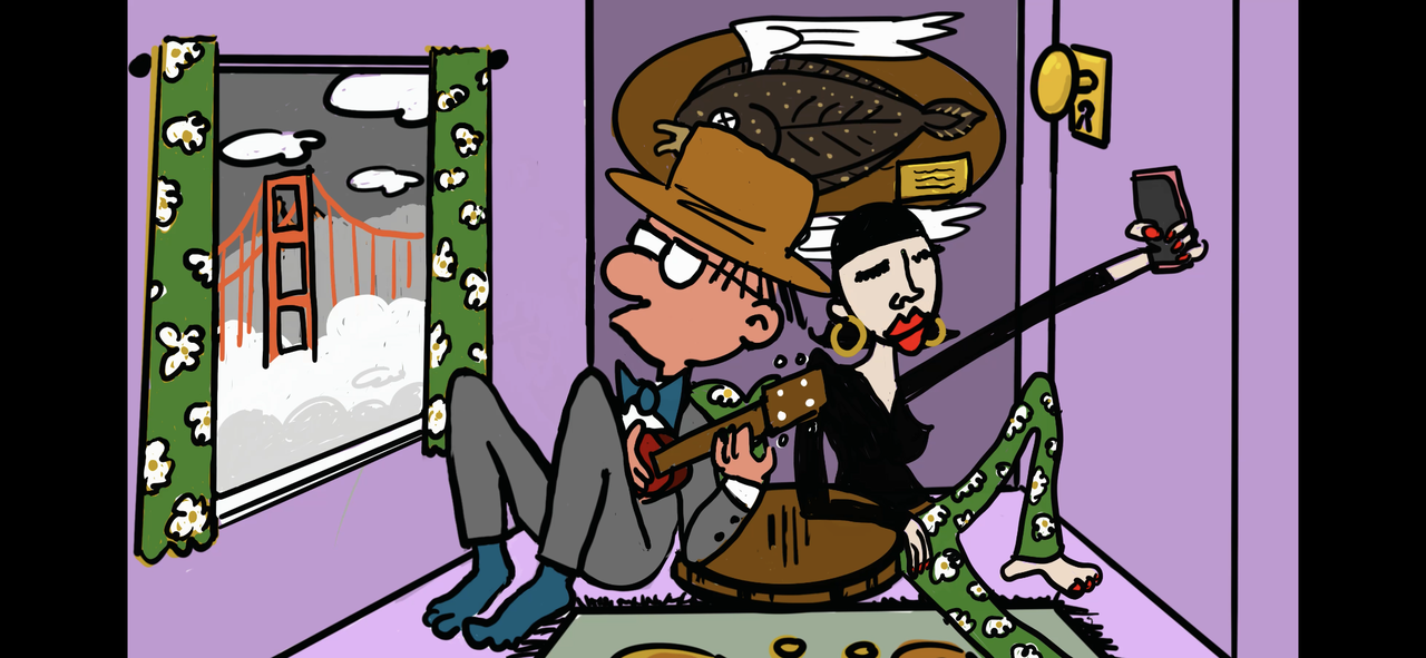The author at home in San Francisco. He's recently fought the devil for the return of his soul (that's it hanging on the wall), but, unbeknownst to him, the landlord has taken on the guise of King Kong in a top hat and is even now scaling the side of his apartment building to collect ze rents. Zut alors!